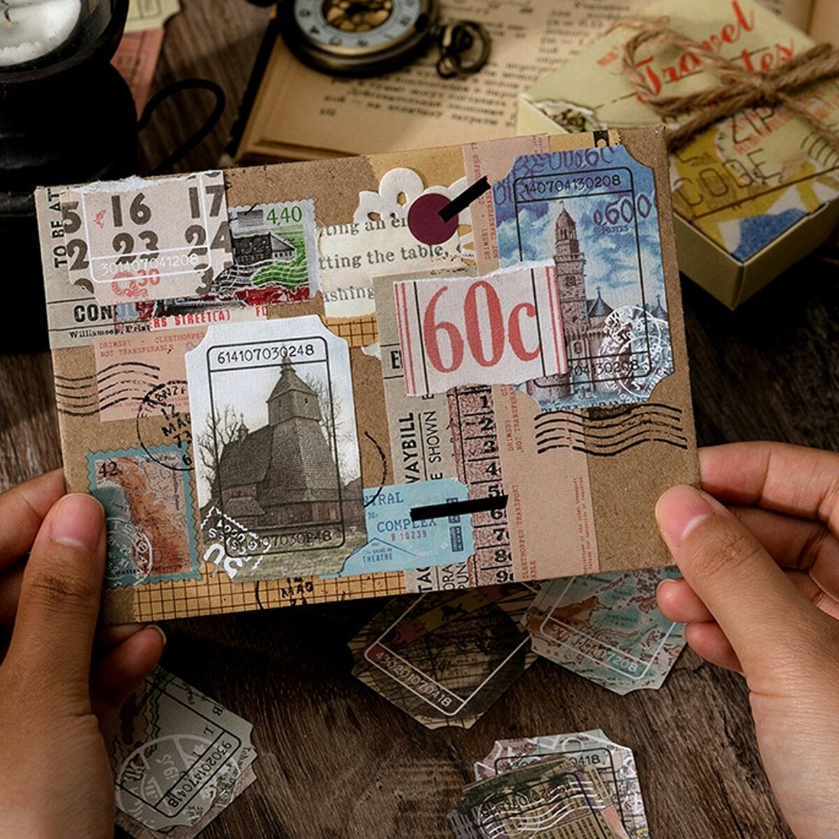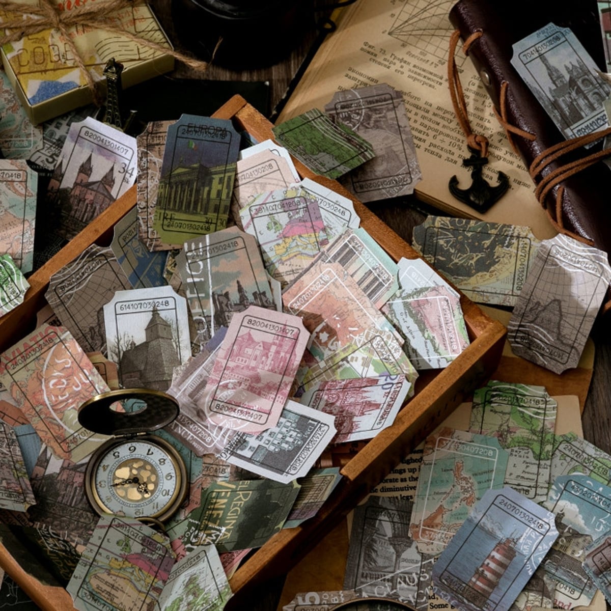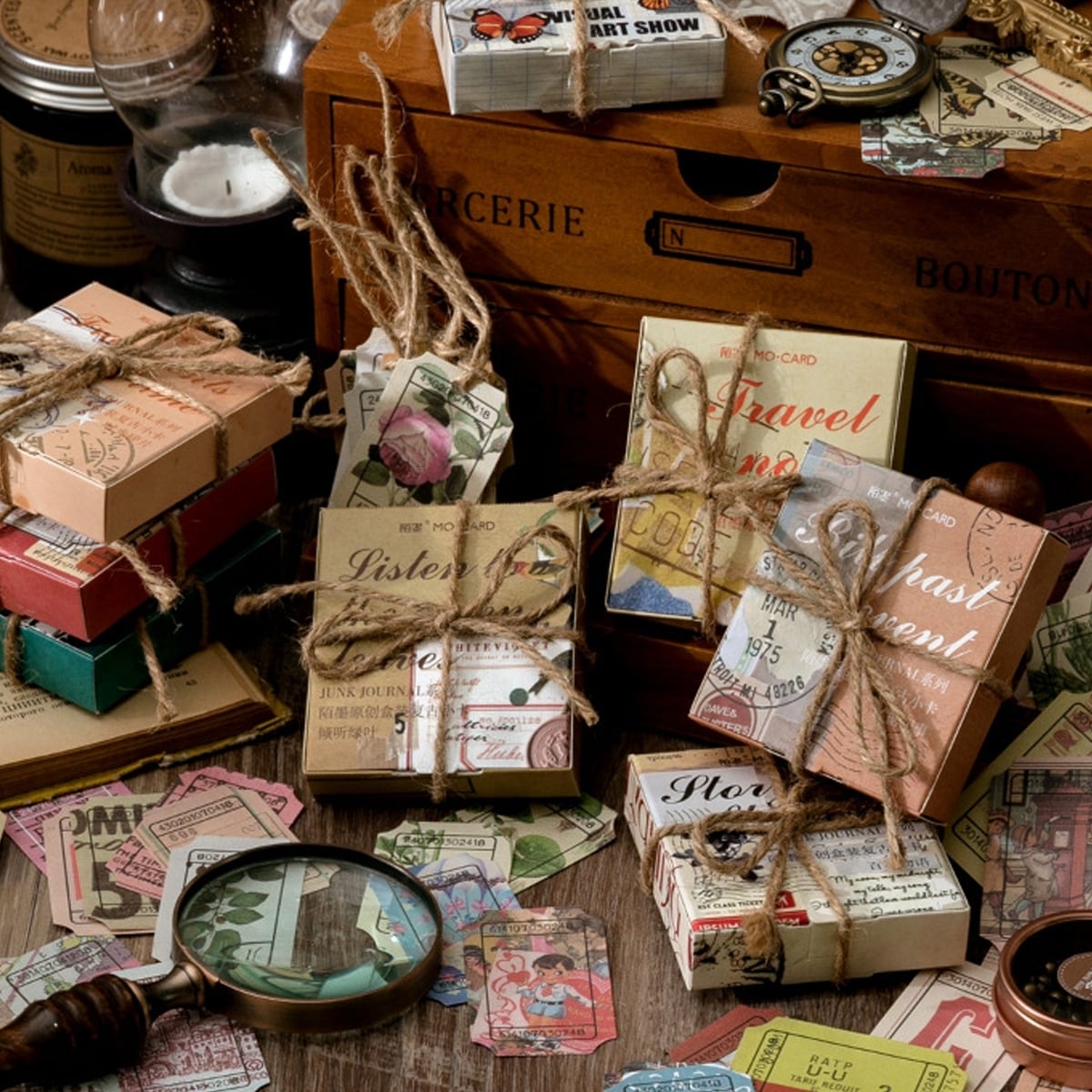 ヴィンテージ風 ミニカード 紙もの 素材紙 全8種 大容量 100枚 レトロ 風景 街並み 花 植物 蝶 絵画 チケット パッケージ 宇宙 海外 コラージュ素材 H19