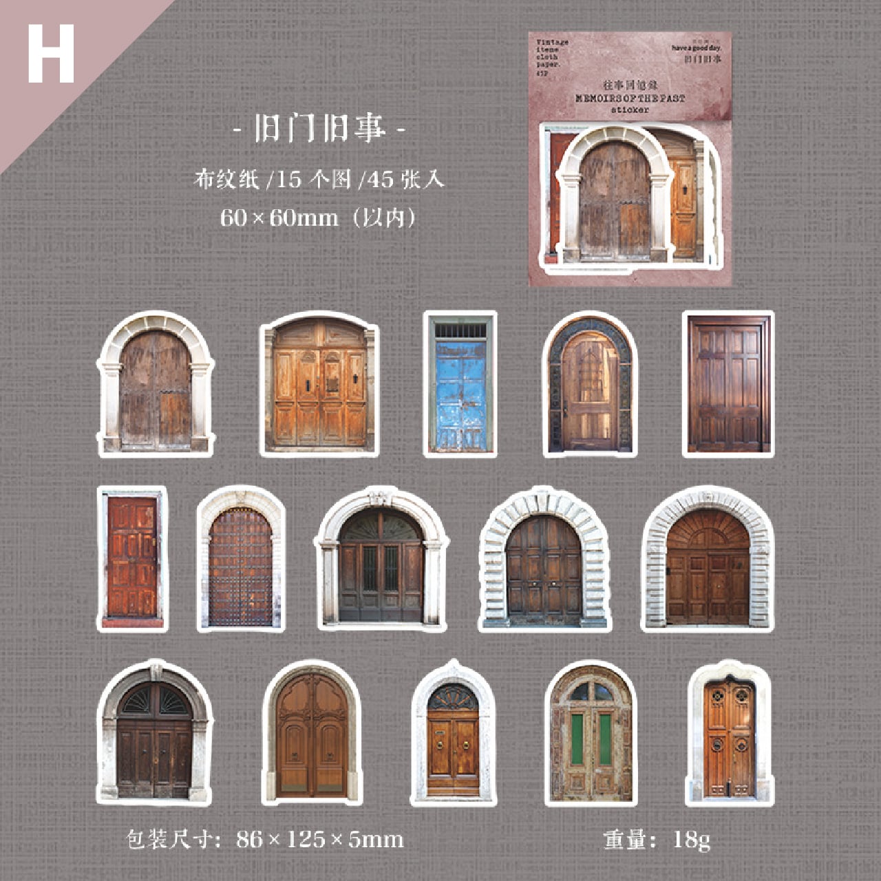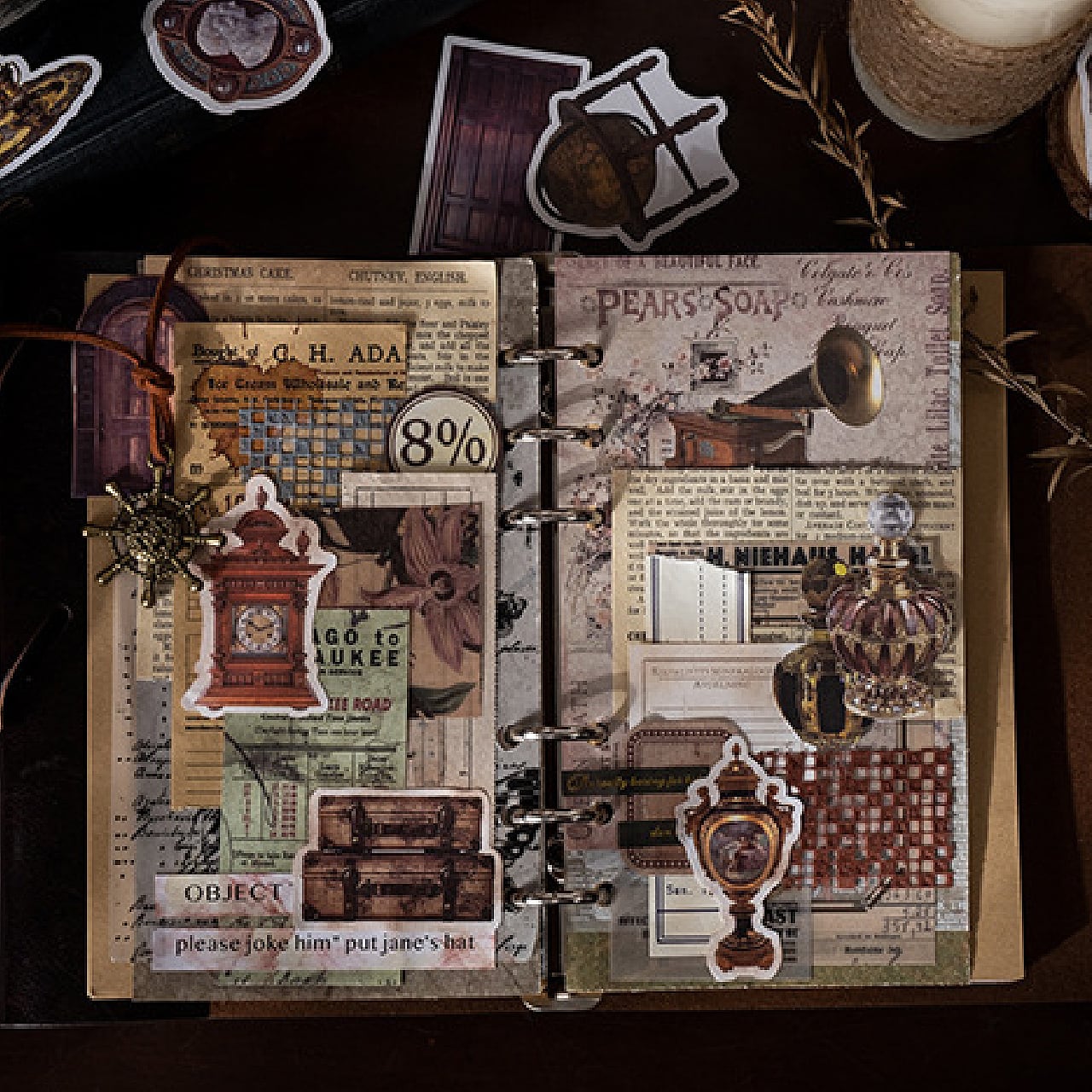 - ステッカー ヴィンテージ風 全8種 45枚入 シール 貼り物 レトロ クラシカル 置物 時計 香水 扉 蓄音機 茶器 アンティークトランク 海外 コラージュ素材 U32